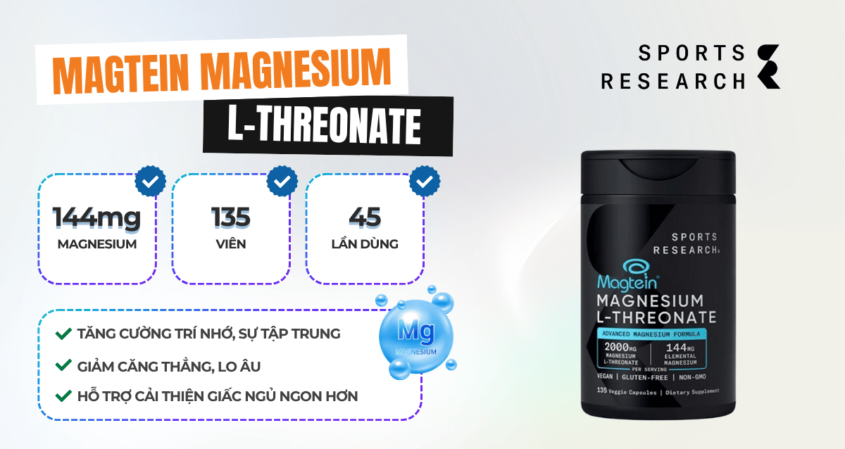 Sports Research Magtein Magnesium L-Threonate là thực phẩm bổ sung magie công nghệ Magtein® độc quyền từ MIT (Viện Công nghệ Massachusetts), nổi bật với khả năng thấm qua hàng rào máu não, giúp cải thiện trí nhớ, giảm stress, ngủ sâu và phục hồi thần kinh – cơ bắp sau tập luyện. Sản phẩm không GMO, không gluten, phù hợp cho gymer, vận động viên và người cần tăng cường sức khỏe tinh thần.