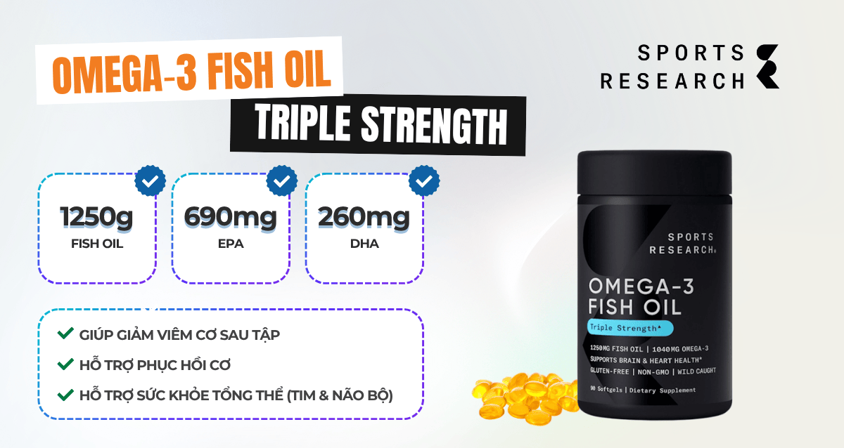 Dầu cá Omega-3 Triple Strength của Sports Research là dòng oil mạnh mẽ có hàm lượng 690 mg EPA và 310 mg DHA cao gấp 3 lần so với dầu cá thông thường. Sử dụng nguồn nguyên liệu chiết xuất từ cá tươi, sản phẩm đảm bảo độ tinh khiết, hỗ trợ sức khỏe tim mạch, não bộ, tổng thể.