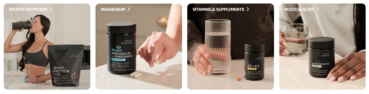 Trải qua hơn 40 năm phát triển, thương hiệu này đã khẳng định vị thế toàn cầu với hàng loạt dòng sản phẩm hỗ trợ sức khỏe và hiệu suất tập luyện như Vitamin D3 + K2, Collagen Peptides, Krill Oil, Omega-3 Fish Oil, Magnesium L-Threonate,... Các sản phẩm của Sports Research đều được kiểm định nghiêm ngặt tại Mỹ, đạt chứng nhận Non-GMO, GMP và không chứa các thành phần gây dị ứng phổ biến như gluten, soy, dairy.