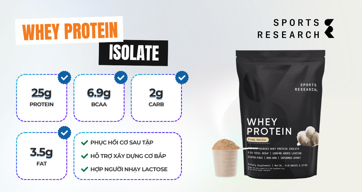 Dòng whey isolate của Sports Research là sản phẩm tăng cơ chuyên biệt: mỗi khẩu phần cung cấp khoảng 25g protein từ sữa bò chất lượng cao, ít lactose, không GMO và đã được kiểm nghiệm nghiêm ngặt.