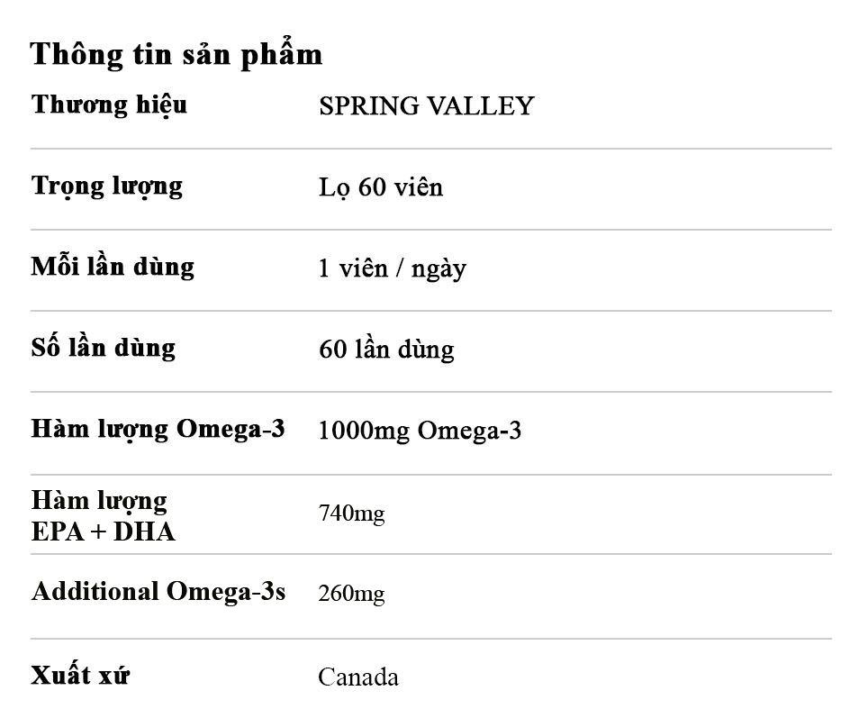 Spring Valley Omega-3 1000mg from Fish Oil bổ sung 1000mg Omega-3 được chiết xuất từ tự nhiên.