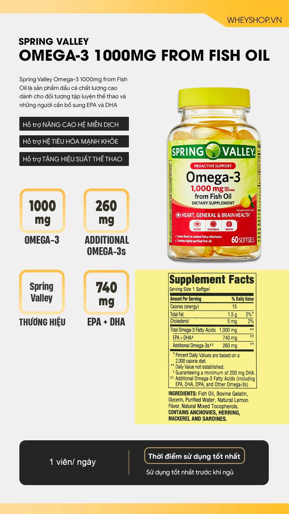 WheyShop là hệ thống bán lẻ thực phẩm bổ sung uy tín hàng đầu tại Việt Nam, được nhiều vận động viên và người tiêu dùng tin tưởng lựa chọn. WheyShop cam kết cung cấp sản phẩm Spring Valley Omega-3 1000mg from Fish Oil chính hãng, có đầy đủ giấy tờ chứng nhận nguồn gốc và chất lượng. Đội ngũ tư vấn viên chuyên nghiệp, giàu kinh nghiệm, sẵn sàng hỗ trợ khách hàng lựa chọn sản phẩm phù hợp và giải đáp mọi thắc mắc.
