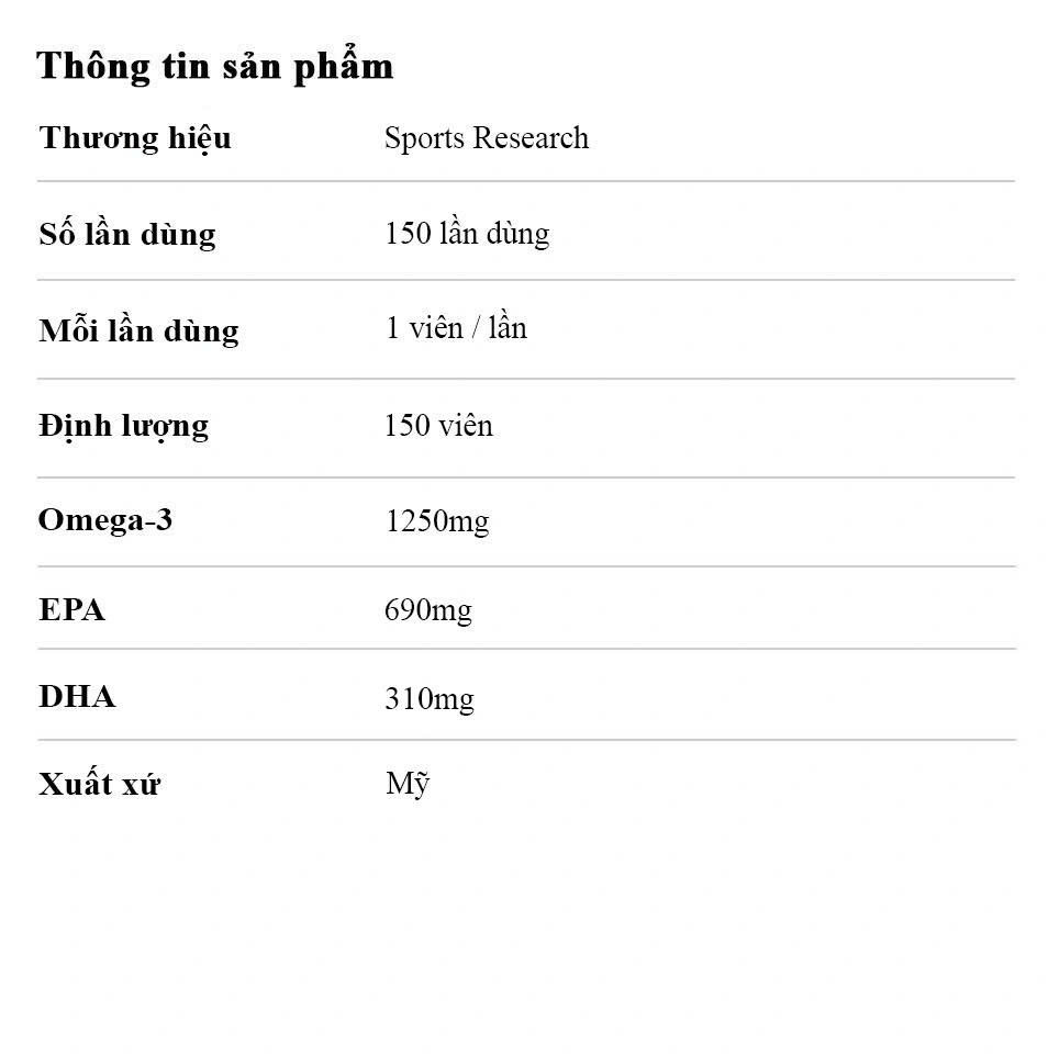 SR Triple Strength Omega-3 Fish Oil là sản phẩm bổ sung Omega-3 đậm đặc, cung cấp 690 mg EPA và 310 mg DHA, gấp 3 lần so với dầu cá thông thường, giúp nâng cao sức khỏe tim mạch và hỗ trợ chức năng não bộ. Sản phẩm chiết xuất từ cá tươi, đảm bảo tinh khiết và không tạp chất, dễ dàng bổ sung vào chế độ dinh dưỡng hàng ngày. Ngoài việc hỗ trợ sức khỏe tim mạch, sản phẩm còn giúp duy trì làn da khỏe mạnh, giảm căng thẳng và cải thiện tâm trạng, là lựa chọn lý tưởng cho những ai cần bổ sung Omega-3 hiệu quả và an toàn. Sports Research là thương hiệu hàng đầu trong thực phẩm chức năng, với hơn 40 năm kinh nghiệm, cung cấp sản phẩm bổ sung dinh dưỡng, vitamin, khoáng chất và dầu cá. Tất cả sản phẩm đều chiết xuất từ nguyên liệu tự nhiên và sản xuất theo tiêu chuẩn nghiêm ngặt, cam kết mang lại chất lượng cao và hiệu quả cho người tiêu dùng. THÀNH PHẦN CHÍNHĐịnh lượng: 150 viên Mỗi lần dùng: 1 viên/ lần dùng Số lần dùng: 150 lần dùng Hàm lượng Dầu cá Omega-3: 1250 mg Hàm lượng EPA : 690 mg Hàm lượng DHA: 310 mg Thương hiệu: Sports Research Xuất xứ: Mỹ |