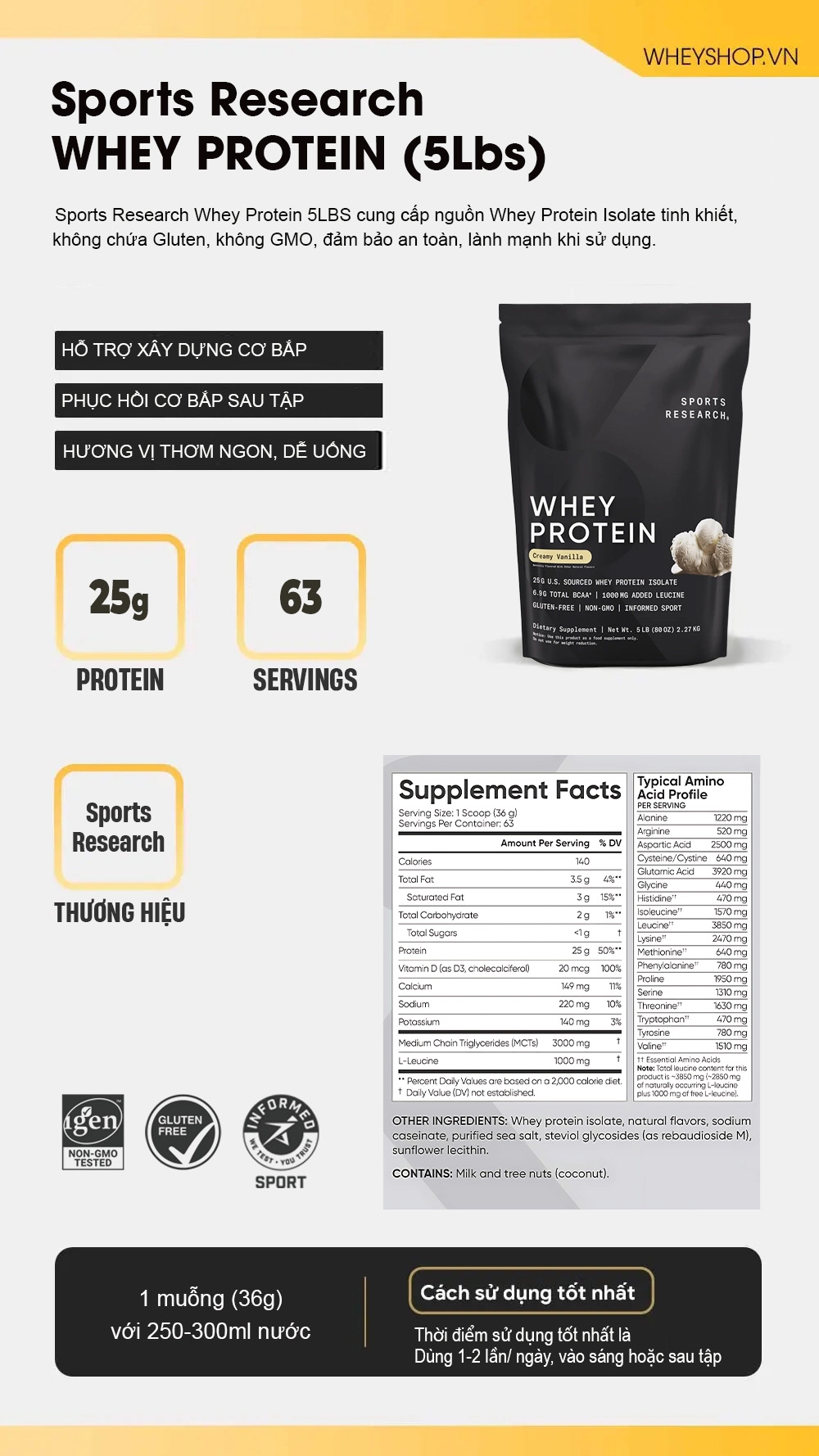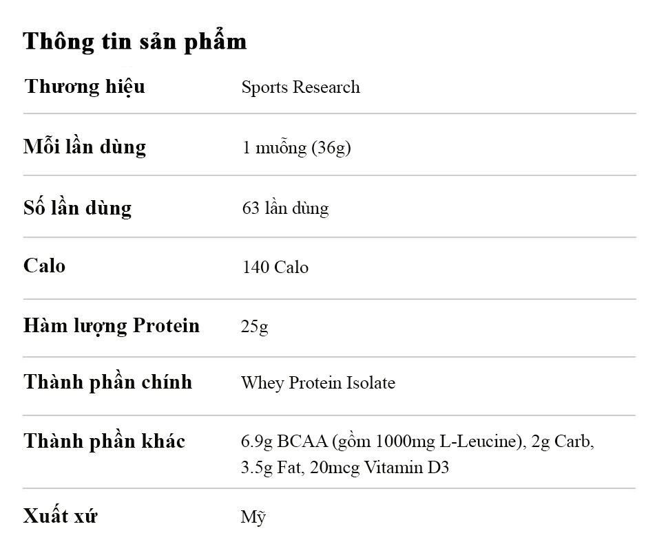 SR Whey Protein Isolate là dòng whey protein cao cấp đến từ thương hiệu Sports Research nổi tiếng toàn cầu với các sản phẩm dinh dưỡng thể thao chất lượng, minh bạch và an toàn. Sản phẩm sử dụng 100% whey protein isolate tinh khiết, loại bỏ gần như hoàn toàn lactose, tạp chất và chỉ giữ lại nguồn đạm tinh khiết, giàu amino acid hỗ trợ xây dựng và phục hồi cơ bắp tối ưu. THÀNH PHẦN CHÍNH Thương hiệu: Sports Research Xuất xứ: Mỹ Mỗi lần dùng: 1 muỗng (36g) Số lần dùng: 63 lần dùng Calo: 140 Calo Hàm lượng Protein: 25g Protein Thành phần chính: Whey Protein Isolate Thành phần khác: