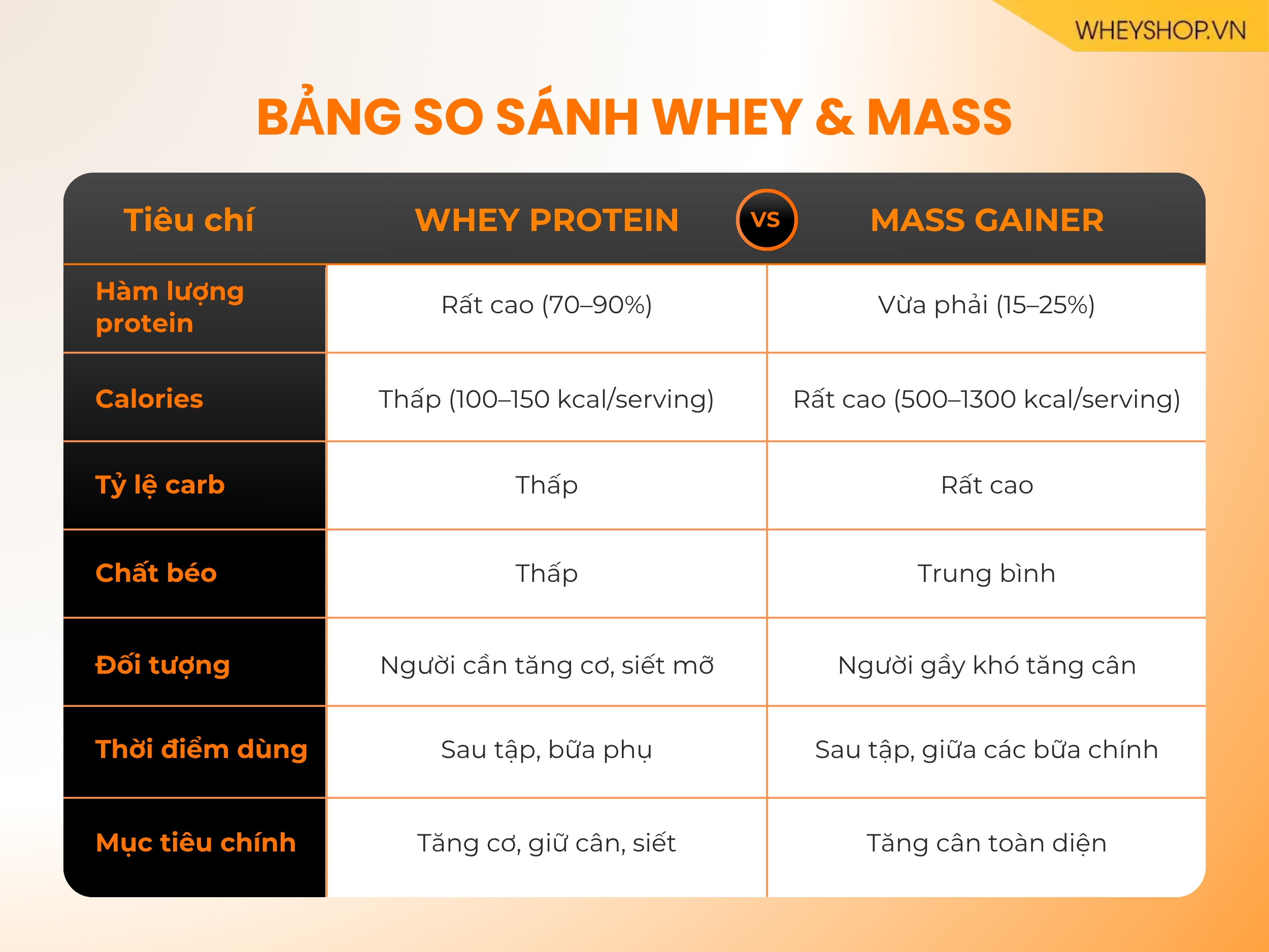 | Tiêu chí | Whey Protein | Mass Gainer |