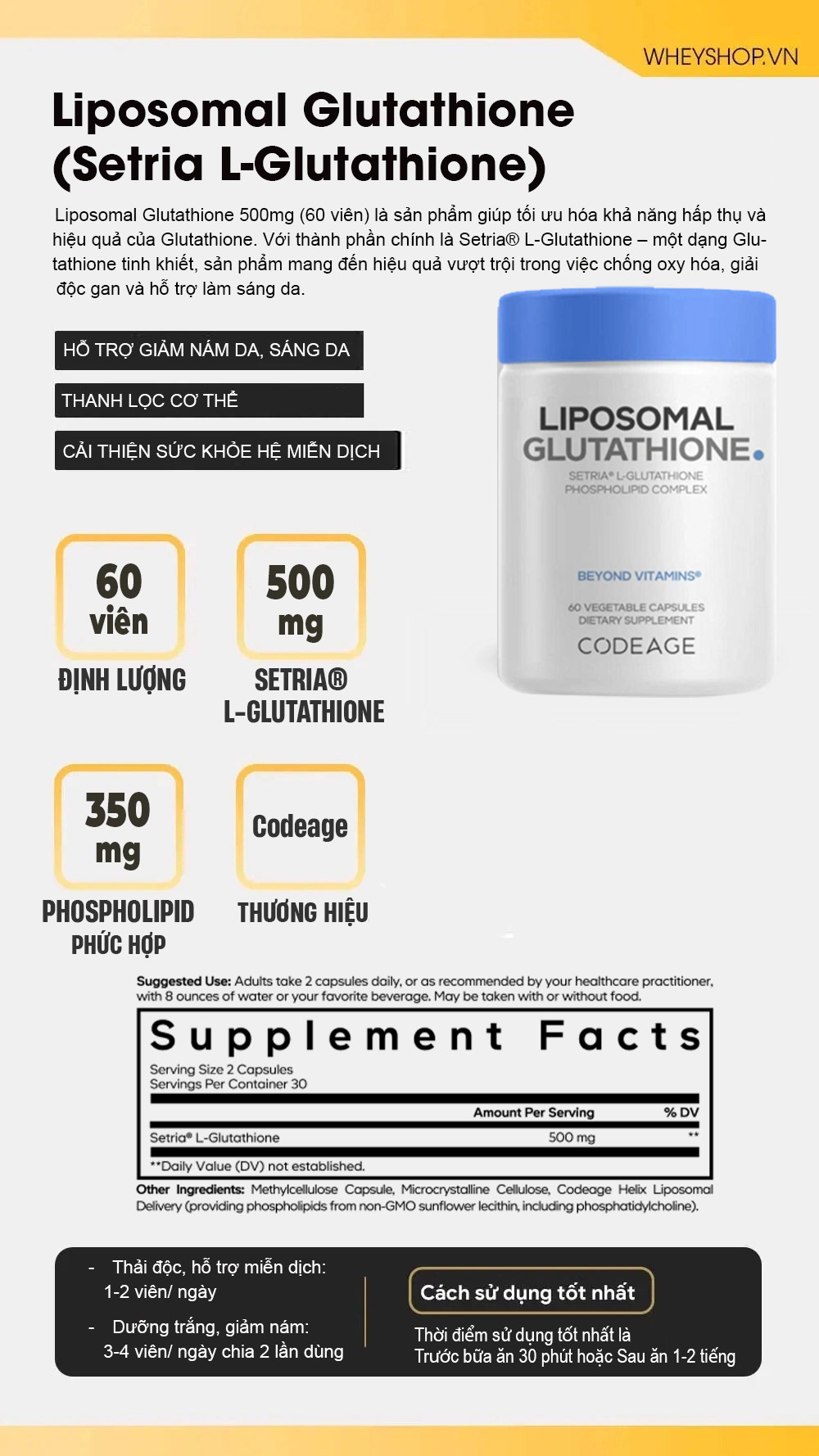 Liposomal Glutathione 500mg là sản phẩm cao cấp của thương hiệu Codeage, được nghiên cứu và phát triển với công nghệ Liposome tiên tiến, giúp tối ưu hóa khả năng hấp thụ và hiệu quả của Glutathione. Với thành phần chính là Setria® L-Glutathione – một dạng Glutathione tinh khiết đạt chuẩn Dược điển Nhật Bản (JP) và Dược điển Hoa Kỳ (USP), sản phẩm mang đến hiệu quả vượt trội trong việc chống oxy hóa, giải độc gan và hỗ trợ làm sáng da. Công nghệ Liposome giúp bảo vệ Glutathione nguyên vẹn khi đi qua hệ tiêu hóa, đảm bảo hoạt chất được hấp thụ tối đa vào cơ thể. Nhờ đó, sản phẩm không chỉ giúp trung hòa các gốc tự do, ngăn ngừa lão hóa mà còn hỗ trợ tăng cường hệ miễn dịch và cải thiện sức khỏe tổng thể. Liposomal Glutathione 500mg đặc biệt phù hợp với những người thường xuyên tiếp xúc với môi trường ô nhiễm, căng thẳng hoặc có nhu cầu cải thiện sắc tố da, giảm nám và làm đều màu da. Với liều dùng tiện lợi, chỉ 1-2 viên mỗi ngày, bạn sẽ nhanh chóng cảm nhận được sự thay đổi tích cực về sức khỏe và làn da. |