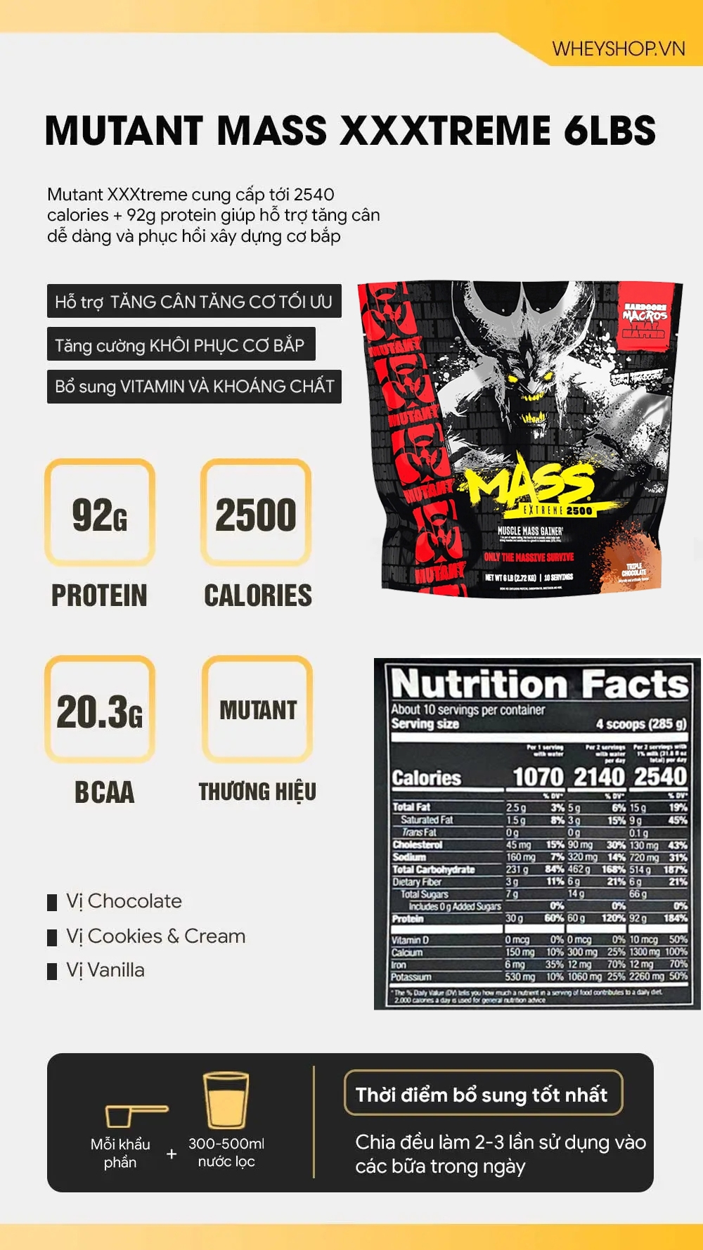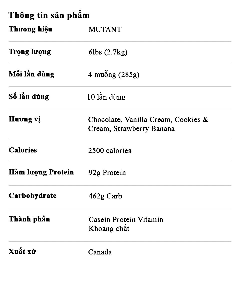 Mutant Mass XXXtreme là sự lựa chọn tốt nhất dành cho người gầy, suy dinh dưỡng. Sản phẩm Mass Gainer này hỗ trợ quá trình trao đổi chất diễn ra nhanh chóng, từ đó cải thiện cân nặng của bản thân. Với lượng calo cao trong mỗi khẩu phần, Mutant Mass XXXtreme được đánh giá cực kỳ hiệu quả đối với người trong tình trạng thiếu cân. Mua sữa tăng cân Mutant Mass XXXtreme giá tốt, chất lượng cao, tránh hàng giả, hãy tham khảo WheyShop - nơi chuyên cung cấp sản phẩm Mutant được nhập khẩu chính hãng. THÀNH PHẦN CHÍNHTrọng lượng: 6Lbs ~ 2.7kg Hàm lượng: