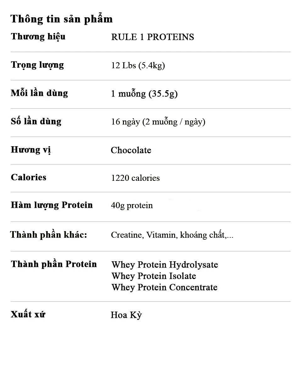 Thành phần chính: Maltodextrin, Whey protein concentrate, Whey protein isolate, Whey protein hydrolyzed Thành phần khác: Creatine, Vitamin, khoáng chất,... Số lần dùng (servings): 16 ngày (2 muỗng / ngày) Thương hiệu: Rule 1 Xuất xứ: Mỹ |
