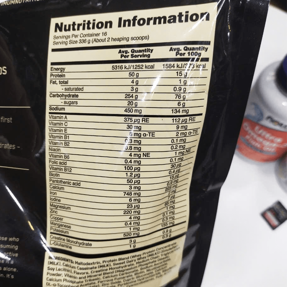THÀNH PHẦN CHÍNH Trọng lượng: 12Lbs ~ 5.4 kg Hàm lượng: 1250 calories + 50g protein + 254g carb Số lần dùng (servings): 16 ngày (2 muỗng/ngày) Thành phần chính: Maltodextrin, Whey protein concentrate, Whey protein isolate Thành phần khác: Creatine, 25+ Vitamin, khoáng chất thiết yếu,... Thương hiệu: Optimum Nutrition (ON) |