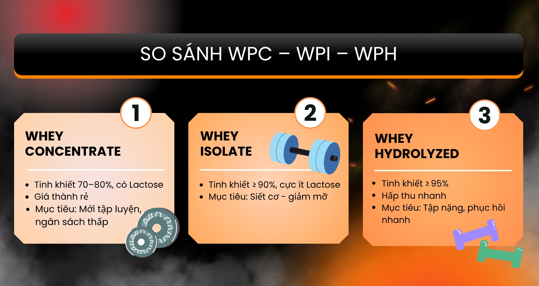 📌 Whey Protein tinh khiết cao như Whey Isolate hoặc Hydrolyzed Whey thường có ít carb và chất béo – phù hợp cho người đang siết cơ, giảm mỡ.