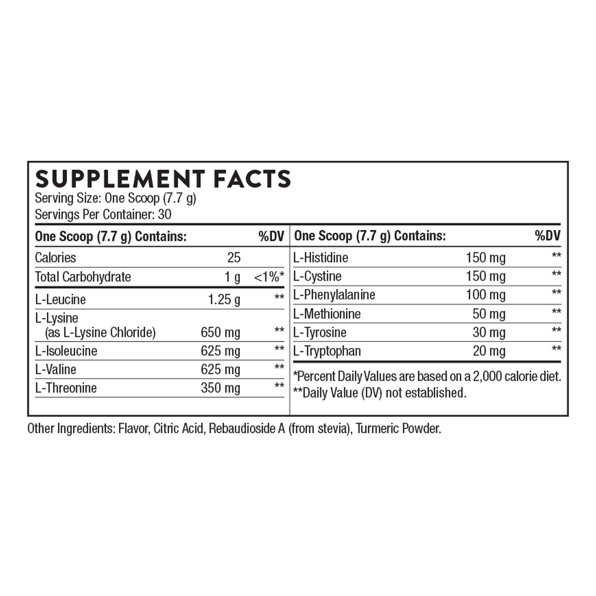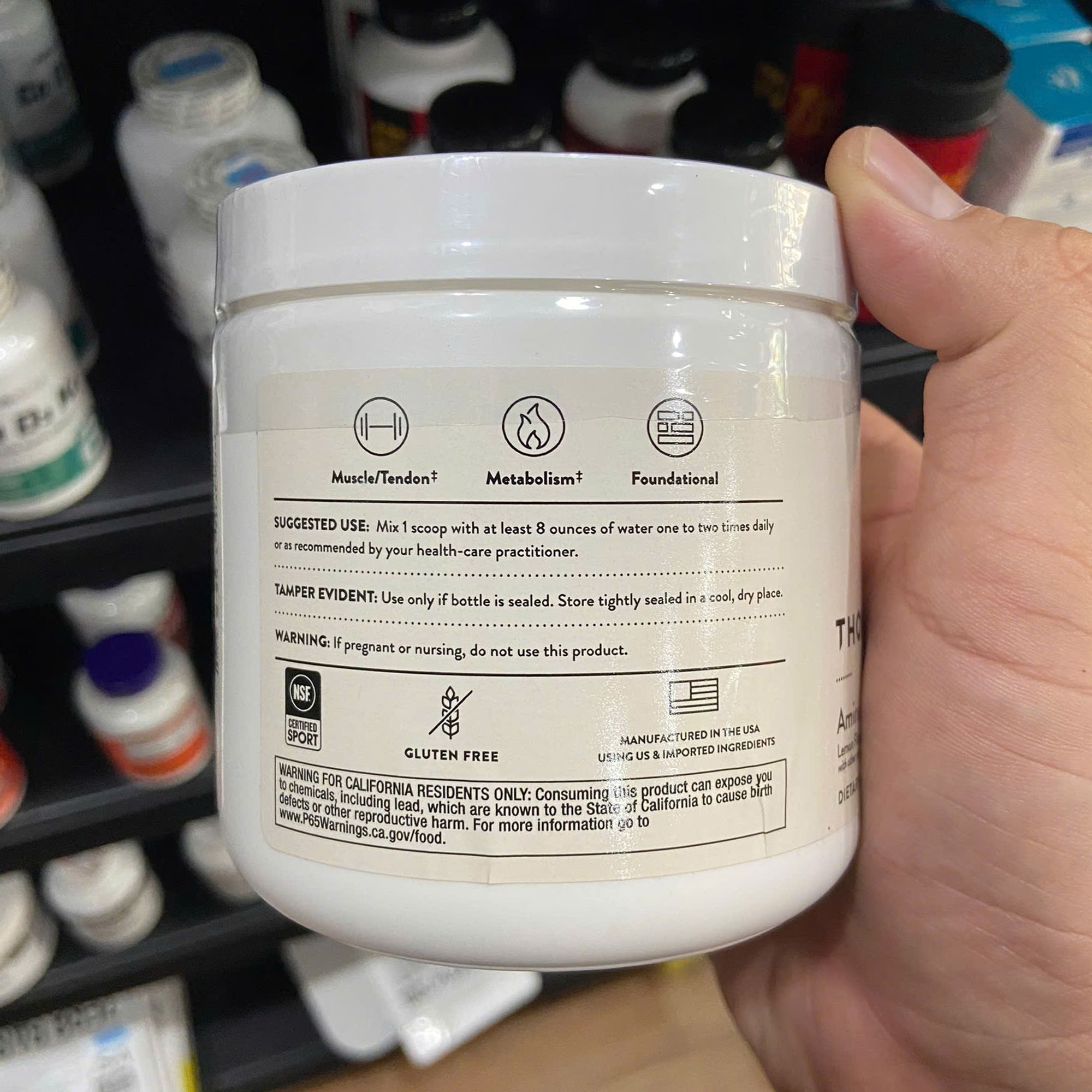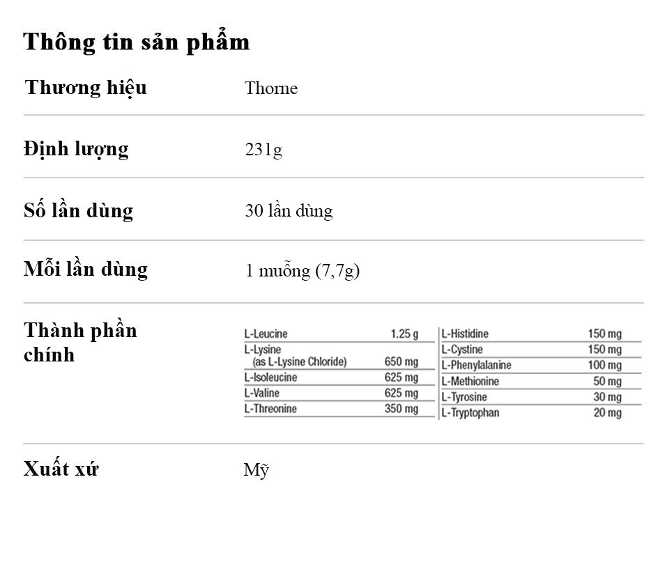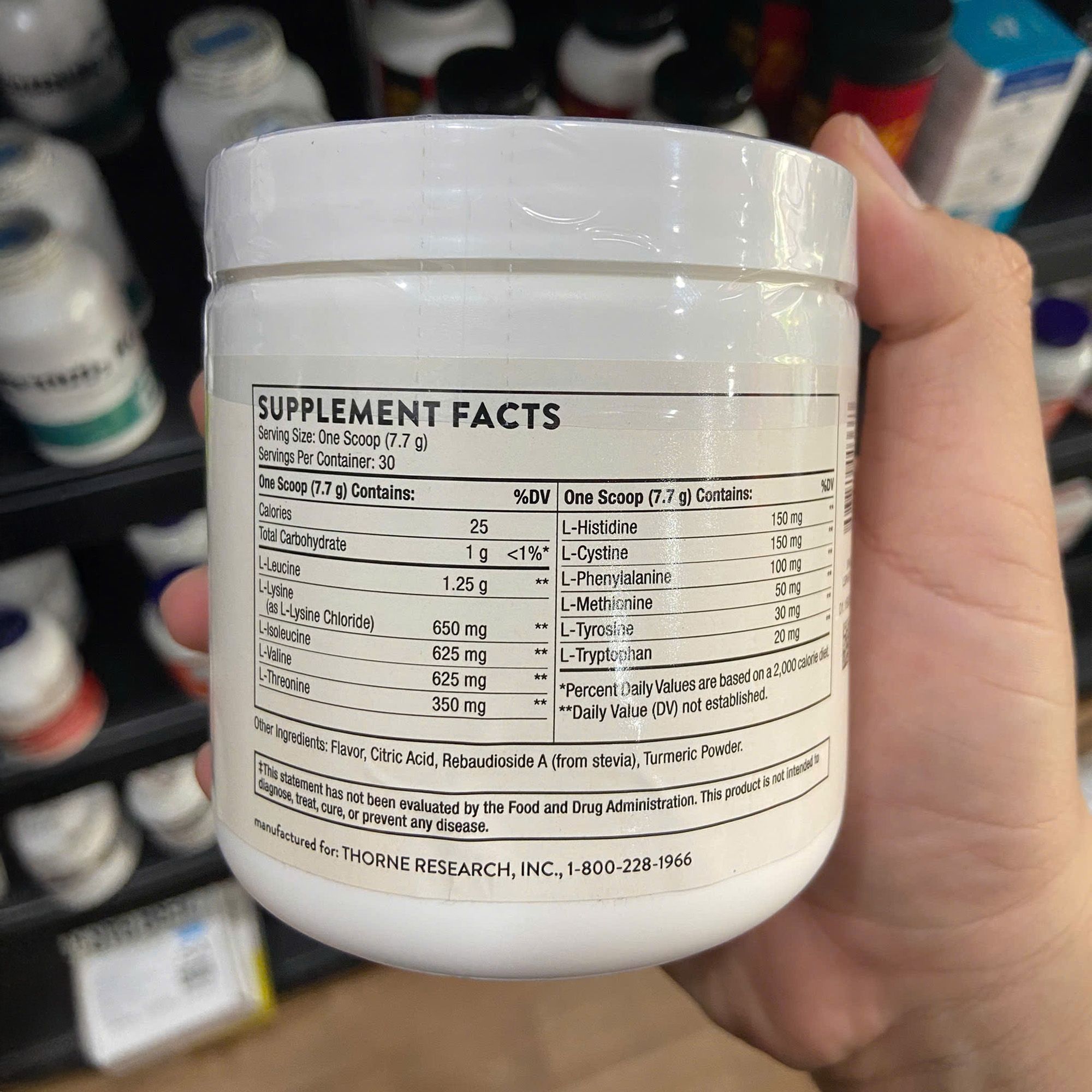 Thorne Amino Complex là sản phẩm bổ sung axit amin thiết yếu (EAA) kết hợp cùng BCAA, giúp hỗ trợ xây dựng và phục hồi cơ bắp hiệu quả cho người tập luyện thể thao. Với công thức cân bằng, dễ hấp thụ và không chứa chất phụ gia gây hại, Thorne Amino Complex mang đến nguồn năng lượng bền bỉ, giảm mệt mỏi trong quá trình tập, đồng thời thúc đẩy tái tạo mô cơ sau vận động cường độ cao. THÀNH PHẦN CHÍNHĐịnh lượng: 231g Số lần dùng: 30 lần dùng Mỗi lần dùng: 1 muỗng (7,7g)/ lần dùng\ Thành phần chính: