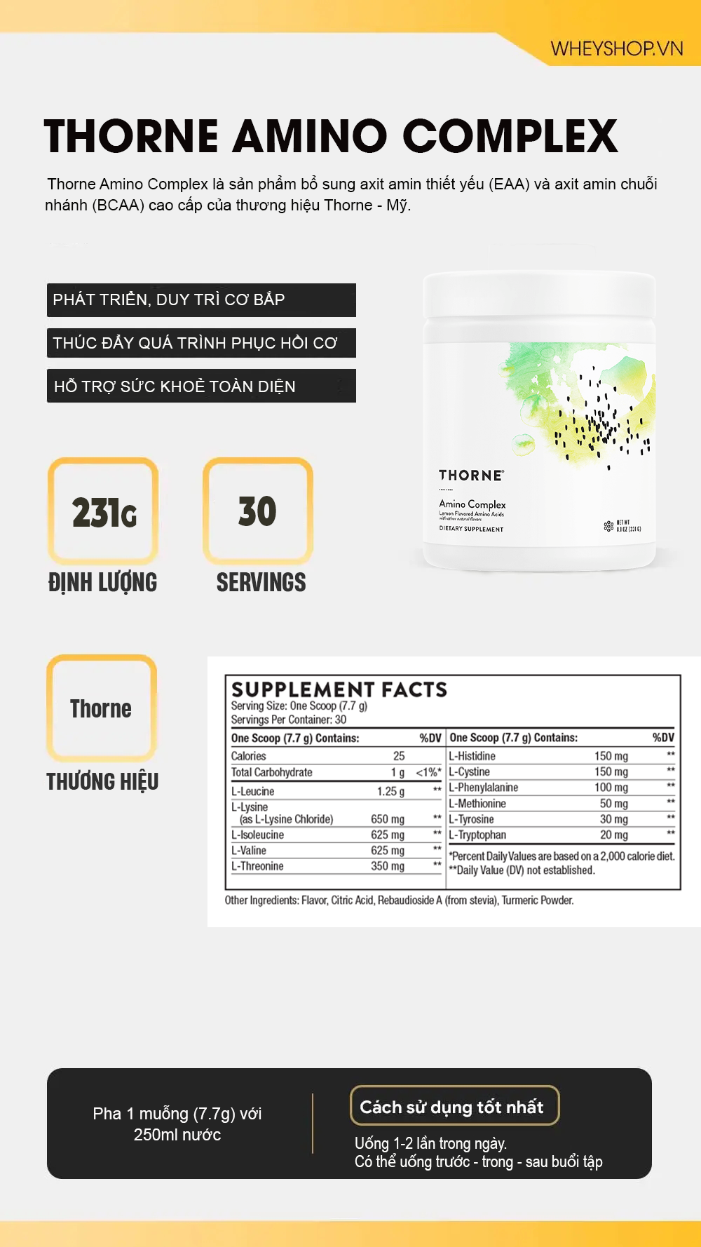 WheyShop là hệ thống bán lẻ thực phẩm bổ sung uy tín hàng đầu tại Việt Nam, được nhiều vận động viên và người tiêu dùng tin tưởng lựa chọn. WheyShop cam kết cung cấp sản phẩm Thorne Amino Complex chính hãng, có đầy đủ giấy tờ chứng nhận nguồn gốc và chất lượng. Đội ngũ tư vấn viên chuyên nghiệp, giàu kinh nghiệm, sẵn sàng hỗ trợ khách hàng lựa chọn sản phẩm phù hợp và giải đáp mọi thắc mắc.