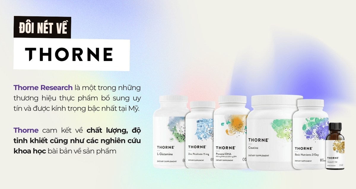Thorne Research là thương hiệu thực phẩm chức năng hàng đầu tại Mỹ, được thành lập từ năm 1984. Với hơn 40 năm kinh nghiệm, Thorne đã xây dựng danh tiếng vững chắc nhờ vào những cam kết về chất lượng, độ tinh khiết cũng như các nghiên cứu khoa học bài bản về sản phẩm. Các sản phẩm của Thorne được sản xuất tại cơ sở đạt chuẩn GMP và NSF Certified for Sport.