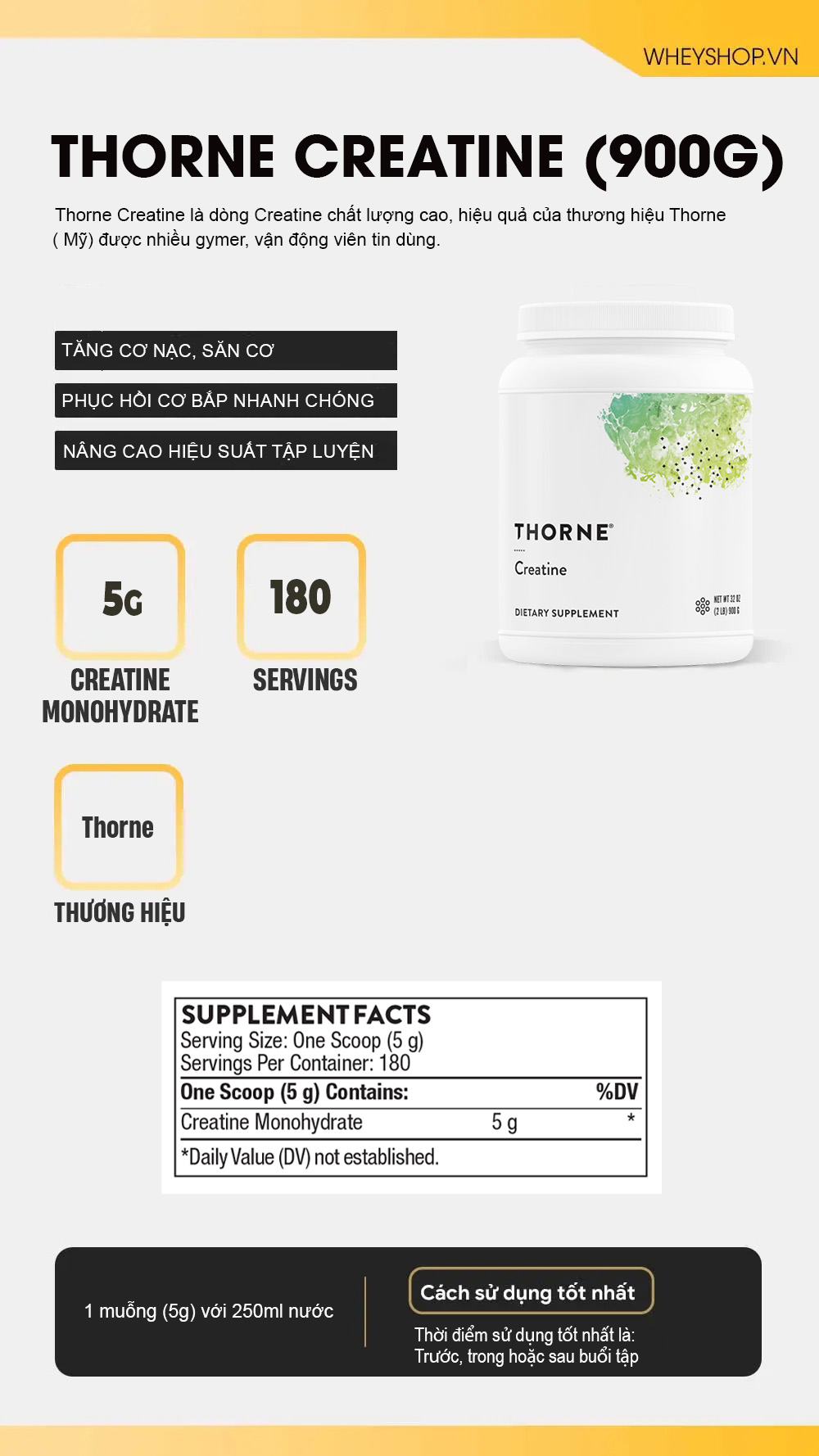 Thorne Creatine là sản phẩm bổ sung dinh dưỡng thể thao cao cấp, chứa 100% creatine monohydrate tinh khiết, giúp tăng cường sức mạnh, cải thiện hiệu suất tập luyện và hỗ trợ phát triển cơ bắp hiệu quả. Khi sử dụng đều đặn, sản phẩm giúp cơ thể tái tạo nhanh nguồn năng lượng ATP – “nhiên liệu” chính cho cơ bắp hoạt động, nhờ đó bạn có thể tập nặng hơn, lâu hơn mà không nhanh kiệt sức. Thorne Creatine có dạng bột siêu mịn, dễ hòa tan, không mùi vị, phù hợp để pha cùng nước lọc, whey protein hoặc pre-workout. Đây là lựa chọn lý tưởng cho gymer, vận động viên và cả những người mới bắt đầu tập luyện muốn tối ưu hiệu quả tập, đẩy nhanh quá trình phục hồi và xây dựng cơ bắp săn chắc, khỏe mạnh. THÀNH PHẦN CHÍNHĐịnh lượng: 900g Số lần dùng: 180 lần dùng Mỗi lần dùng: 1 muỗng (5g) Hàm lượng Creatine Monohydrate: 5g Thương hiệu: Thorne Xuất xứ: Mỹ |