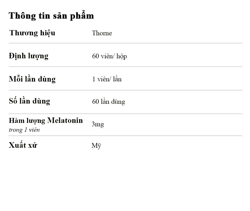 Thorne Melaton-3™ là giải pháp giúp bạn lấy lại giấc ngủ trọn vẹn và chất lượng. Với hàm lượng 3mg melatonin trong mỗi viên, sản phẩm hỗ trợ cơ thể điều hòa nhịp sinh học, dễ dàng chìm vào giấc ngủ sâu và hạn chế tình trạng trằn trọc, mất ngủ hay rối loạn giấc ngủ do căng thẳng, tuổi tác hoặc thay đổi múi giờ. Khác biệt của Thorne Melaton-3™ nằm ở công thức tinh khiết, không chứa gluten, không chất phụ gia gây hại, đảm bảo an toàn ngay cả khi sử dụng lâu dài. Đây là lựa chọn lý tưởng cho người thường xuyên căng thẳng, nhân viên văn phòng áp lực cao, vận động viên cần phục hồi nhanh hay bất kỳ ai mong muốn cải thiện chất lượng giấc ngủ để thức dậy tràn đầy năng lượng và tinh thần sảng khoái mỗi ngày. THÀNH PHẦN CHÍNHĐịnh lượng: 60 viên/ hộp Số lần dùng: 60 lần dùng Mỗi lần dùng: 1 viên/ lần Hàm lượng Melatonin trong 1 viên: 3mg Thương hiệu: Thorne Xuất xứ: Mỹ |