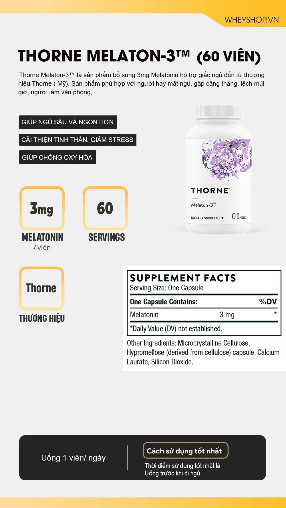 WheyShop là hệ thống bán lẻ thực phẩm bổ sung uy tín hàng đầu tại Việt Nam, được nhiều vận động viên và người tiêu dùng tin tưởng lựa chọn. WheyShop cam kết cung cấp sản phẩm Thorne Melaton-3™ chính hãng, có đầy đủ giấy tờ chứng nhận nguồn gốc và chất lượng. Đội ngũ tư vấn viên chuyên nghiệp, giàu kinh nghiệm, sẵn sàng hỗ trợ khách hàng lựa chọn sản phẩm phù hợp và giải đáp mọi thắc mắc.