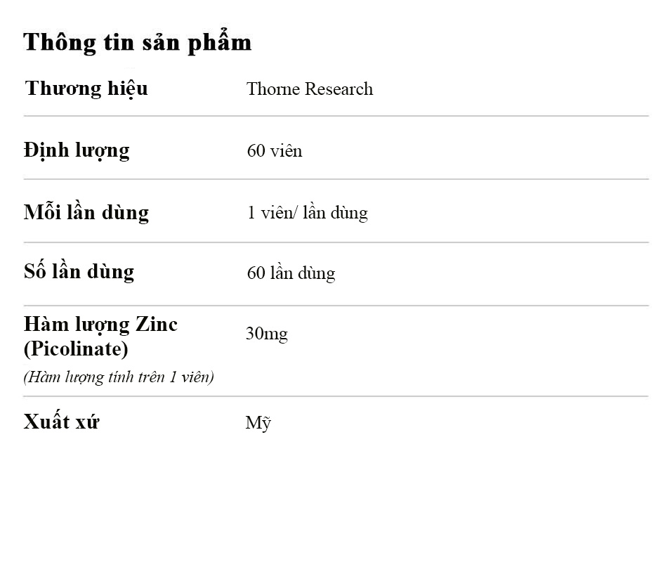 Thorne Zinc Picolinate 30mg là sản phẩm bổ sung kẽm đến từ thương hiệu Thorne Research – một trong những hãng thực phẩm bổ sung được các chuyên gia y tế và vận động viên chuyên nghiệp tại Mỹ tin dùng. Sản phẩm cung cấp 30mg kẽm dạng Picolinate – dạng kẽm hữu cơ có khả năng hấp thu vượt trội so với các dạng kẽm thông thường như zinc oxide hay zinc sulfate. Việc bổ sung Thorne Zinc Picolinate 30mg giúp tăng cường hệ miễn dịch, hỗ trợ sản xuất hormone testosterone, thúc đẩy quá trình tổng hợp protein và phục hồi cơ bắp. Đồng thời duy trì làn da, mái tóc và móng khỏe mạnh. Đặc biệt, sản phẩm không chứa gluten, đậu nành, hay phụ gia nhân tạo, phù hợp cho cả người ăn chay và người có cơ địa nhạy cảm. Nếu bạn đang tìm một nguồn kẽm chất lượng cao, dễ hấp thu và an toàn, Thorne Zinc Picolinate 30mg là lựa chọn tối ưu để bổ sung vi chất và nâng cao sức khỏe toàn thân mỗi ngày.