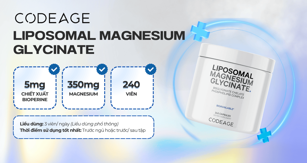 Code Age Magnesium cung cấp magiê dễ hấp thụ, hỗ trợ hoạt động thần kinh – cơ và giúp điều hòa giấc ngủ. Magnesium rất quan trọng với vận động viên và gymer vì liên quan đến co giãn cơ, giảm chuột rút và cải thiện sức bền. Đây là sản phẩm lý tưởng cho người thường xuyên căng thẳng hoặc thiếu ngủ.