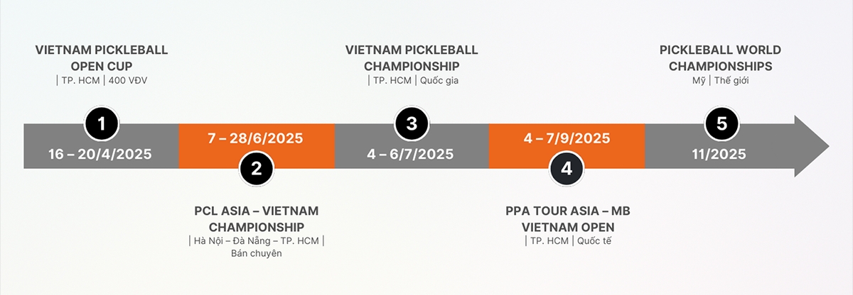 - PCL Asia - Vietnam Championship (7 - 28/6, Hà Nội - Đà Nẵng - TP. HCM) thuộc hệ thống Pickleball Champions League Asia, cơ hội cho VĐV bán chuyên.
