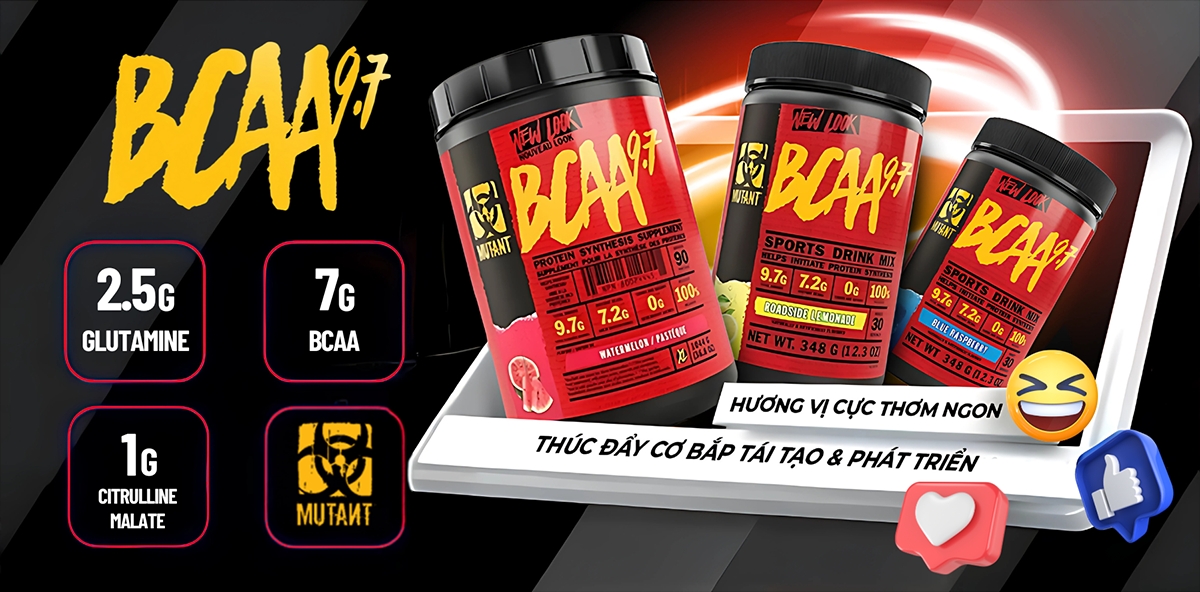 Mutant BCAA 9.7 là dòng sản phẩm BCAA nổi bật đến từ thương hiệu Mutant, được nhiều gymer, vận động viên tin dùng sau những buổi tập nặng. Sản phẩm cung cấp tới 7.2g BCAA theo tỷ lệ vàng 2:1:1 (Leucine – Isoleucine – Valine) trong mỗi khẩu phần, giúp phục hồi cơ bắp nhanh chóng, tăng sức bền đồng thời thúc đẩy tăng trưởng và bảo vệ khối cơ nạc.