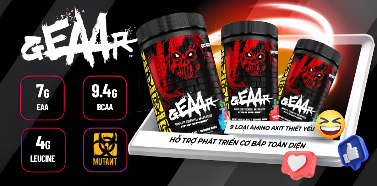 Mutant GEAAR là dòng EAA (Essential Amino Acids – axit amin thiết yếu) được Mutant nghiên cứu và phát triển dành riêng cho người tập gym, thể hình và vận động viên. Khác với BCAA chỉ chứa 3 axit amin chuỗi nhánh, GEAAR cung cấp 9 axit amin thiết yếu, bao gồm cả BCAA, giúp cơ thể tổng hợp protein hoàn chỉnh, phục hồi cơ bắp tối đa và hỗ trợ phát triển cơ nạc hiệu quả hơn.