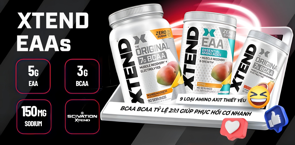 Scivation Xtend Original BCAA là một trong những dòng BCAA nổi tiếng và bán chạy nhất trên thế giới được nhiều gymer tin dùng. Sản phẩm nổi bật nhờ công thức 7g BCAA theo tỷ lệ chuẩn 2:1:1 (Leucine – Isoleucine – Valine), mang đến hiệu quả tối ưu trong việc thúc đẩy tổng hợp protein, giảm đau nhức cơ bắp sau tập và hỗ trợ phục hồi nhanh chóng. Ngoài ra, Xtend còn bổ sung electrolytes giúp duy trì cân bằng điện giải, ngăn ngừa tình trạng mất nước khi tập luyện cường độ cao.