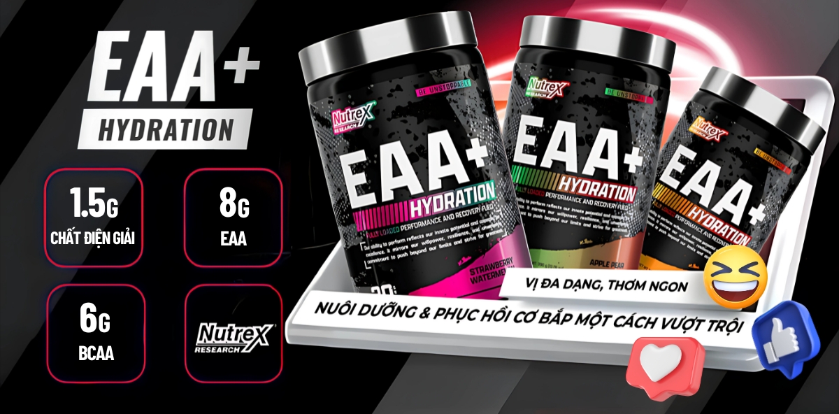 Nutrex EAA + Hydration là dòng bổ sung EAA kết hợp với BCAA và các chất điện giải, được thiết kế nhằm hỗ trợ phục hồi cơ bắp, tăng tổng hợp protein, đồng thời bổ sung nước và khoáng chất trong quá trình tập luyện. Đây là một sản phẩm thuộc thương hiệu Nutrex Research (Mỹ) – nổi tiếng với các dòng thực phẩm bổ sung hiệu suất cao.