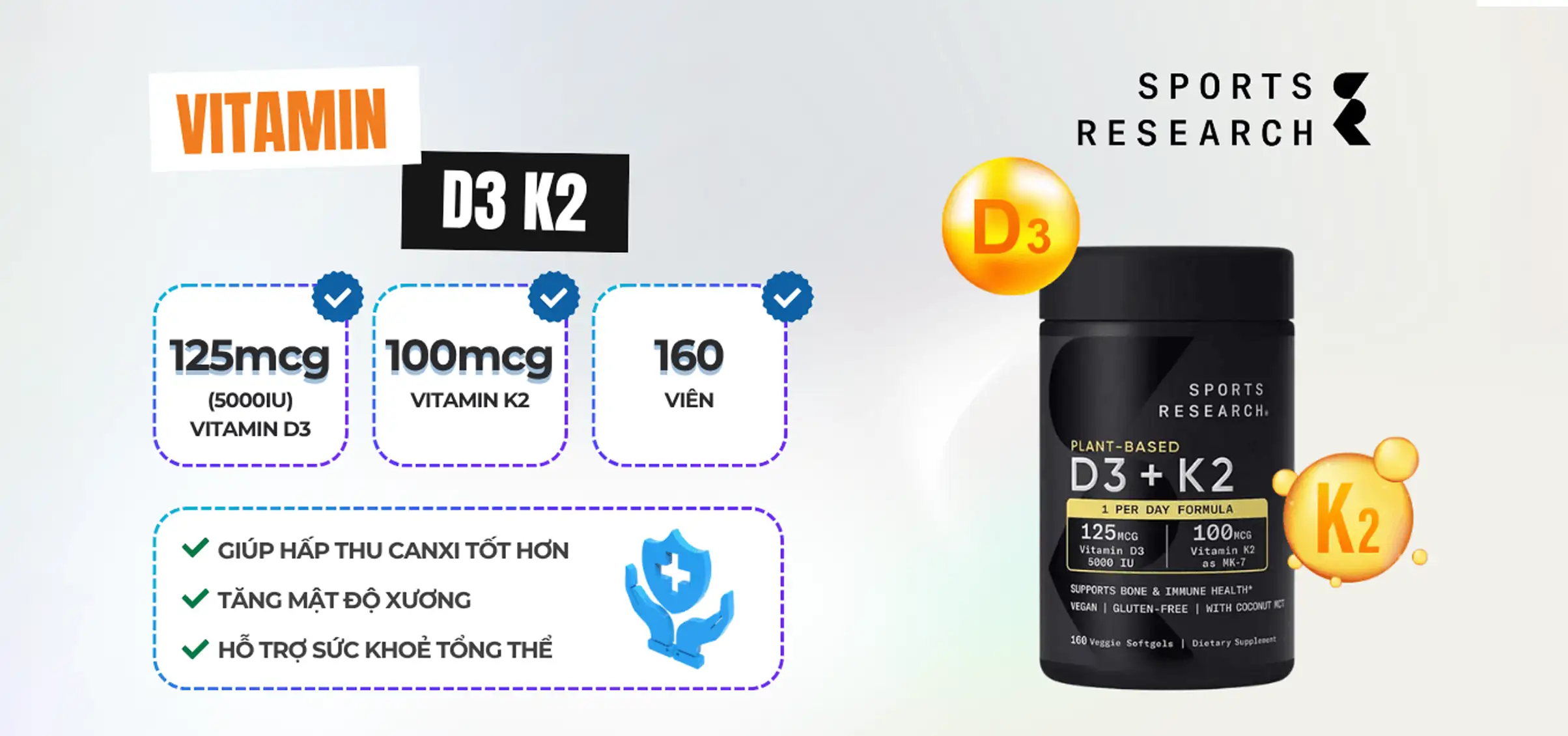 Vitamin D3 K2 là bộ đôi vitamin quan trọng giúp duy trì sức khỏe xương khớp toàn diện. Vitamin D3 hỗ trợ cơ thể hấp thụ canxi trong khi Vitamin K2 giúp phân phối canxi đến các xương và răng, đồng thời ngăn ngừa sự lắng đọng canxi trong mạch máu.