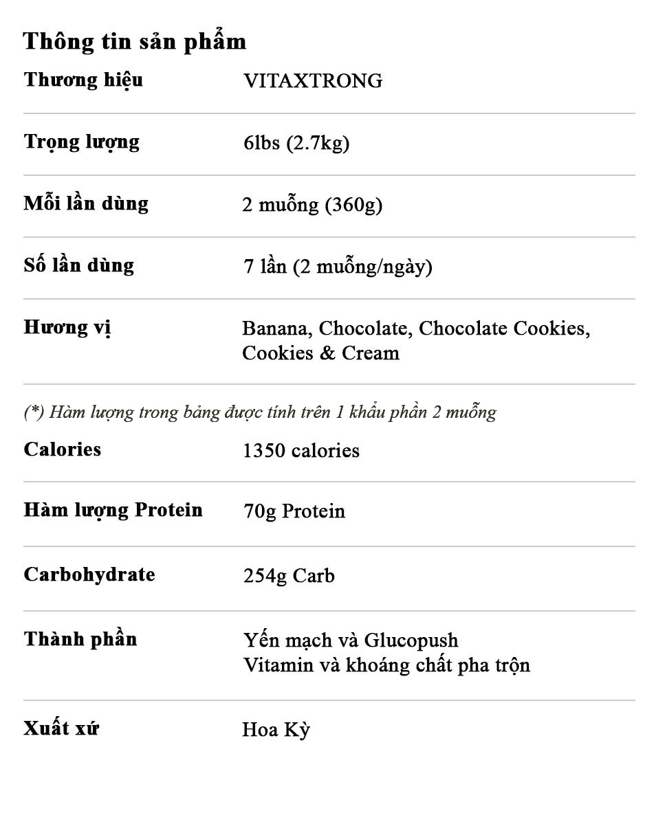 VitaXtrong Mega Mass bao gồm protein, carbohydrate phức hợp, chất béo lành mạnh, vitamin và khoáng chất.