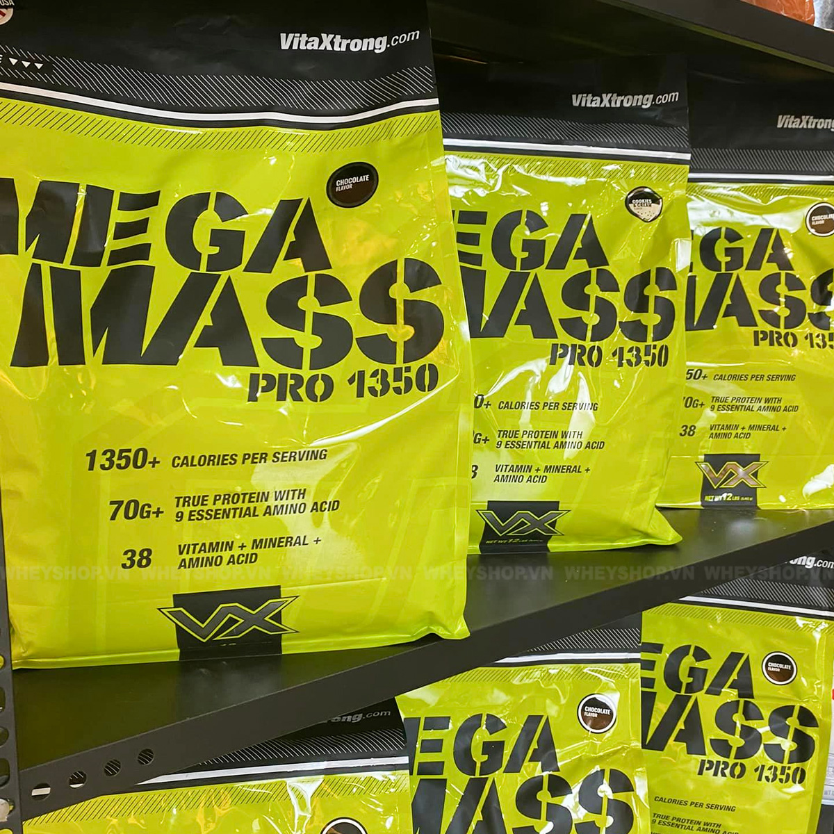 VitaXtrong Mega Mass 1350 là sản phẩm Mass Gainer hỗ trợ tăng cân và tăng cơ nạc vượt trội hàng đầu hiện nay trên thị trường với công thức đột phá cùng 1350 calories + 70g protein phức hợp. Sản phẩm được nghiên cứu và sản xuất bởi thương hiệu VitaXtrong hàng đầu tại Mỹ. Đặc biệt, dòng Mass Gainer này phù hợp với những người gầy lâu năm, khó tăng cân, người kén ăn, người hấp thu kém. Ngay cả những vận động viên, gymer cũng nên sử dụng Mega Mass để đạt được cân nặng tiêu chuẩn. Nếu bạn không có nhu cầu tăng cân nhưng vẫn cần 1 bữa ăn phụ gọn nhẹ, tiện lợi thì Mega Mass luôn là sự lựa chọn hàng đầu. THÀNH PHẦN CHÍNHĐịnh lượng: 6Lbs (2.7kg) Serving size: 2 muỗng (360g) Số lần dùng (servings): 7 lần (2 muỗng/ngày) Thành phần ( hàm lượng tính trên 2 muỗng/ khẩu phần )