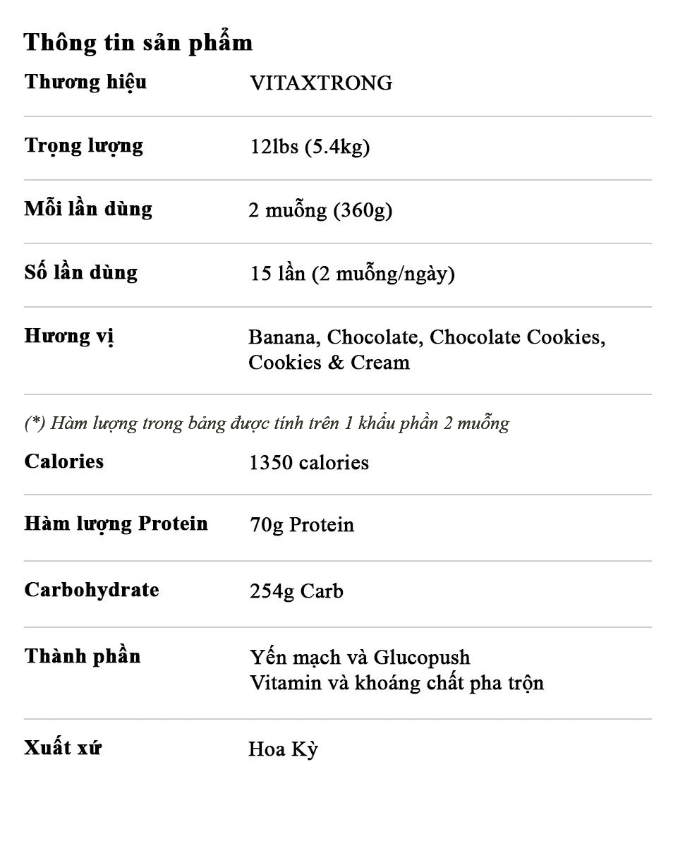 VitaXtrong Mega Mass bao gồm protein, carbohydrate phức hợp, chất béo lành mạnh, vitamin và khoáng chất.