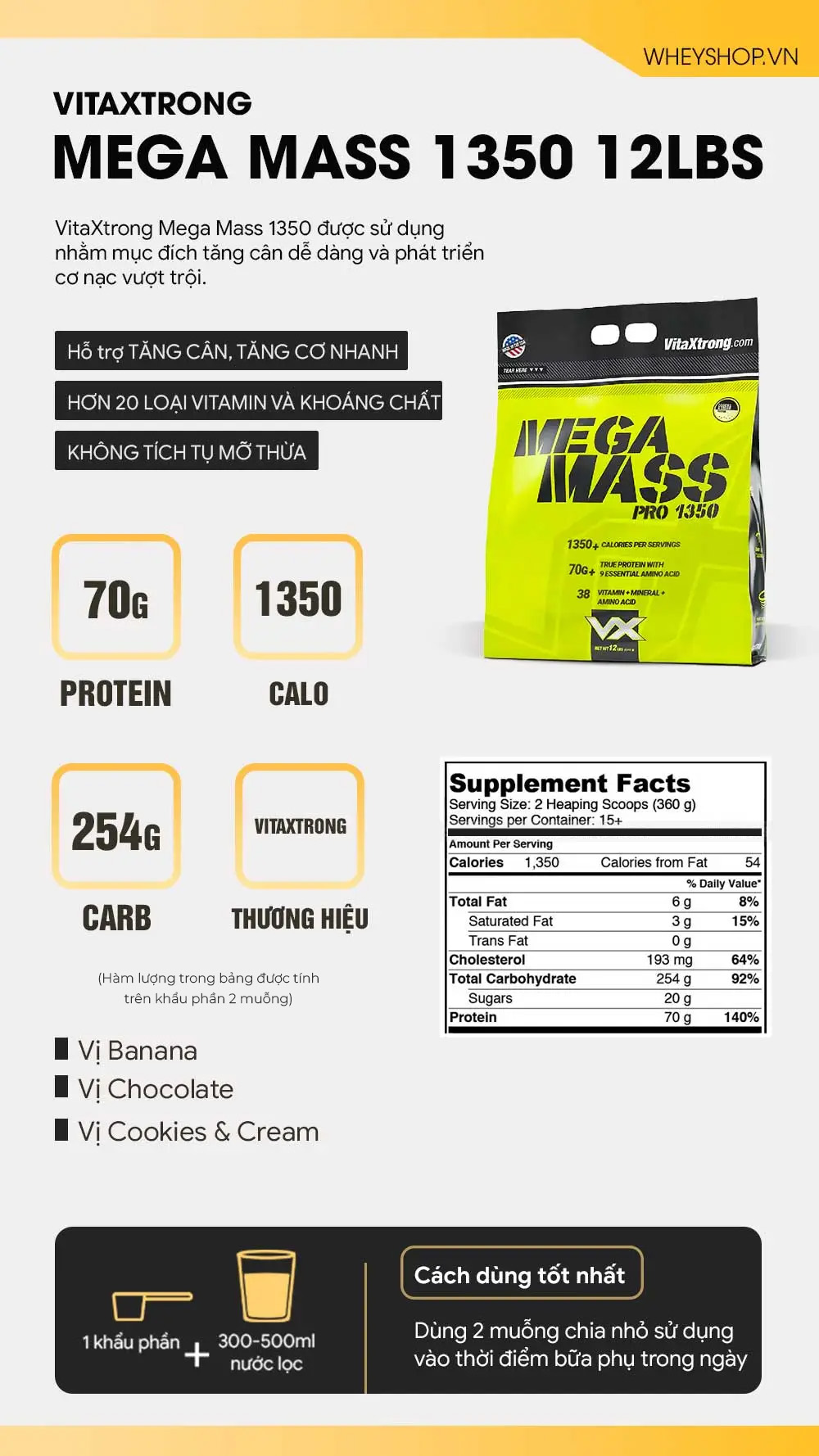 VitaXtrong Mega Mass Pro 1350 là sản phẩm Mass Gainer hỗ trợ tăng cân và tăng cơ nạc vượt trội hàng đầu hiện nay trên thị trường với công thức đột phá cùng 1350 calories + 70g protein phức hợp. Sản phẩm được nghiên cứu và sản xuất bởi thương hiệu VitaXtrong hàng đầu tại Mỹ. Mega Mass VitaXtrong được thương hiệu VitaXtrong hàng đầu tại Mỹ nghiên cứu và đưa ra thị trường. VitaXtrong là thương hiệu lớn luôn tập trung vào chất lượng sản phẩm tốt nhất, bởi vậy các sản phẩm VitaXtrong an toàn cho sức khỏe người dùng. Đặc biệt, Mega Mass phù hợp với những người gầy lâu năm, khó tăng cân, người kén ăn, người hấp thu kém. Ngay cả những vận động viên, gymer cũng nên sử dụng dòng Mass Gainer này để đạt được cân nặng tiêu chuẩn. Nếu bạn không có nhu cầu tăng cân nhưng vẫn cần 1 bữa ăn phụ gọn nhẹ, tiện lợi thì Mega Mass luôn là sự lựa chọn hàng đầu. THÀNH PHẦN CHÍNHĐịnh lượng: 12 Lbs (5,44kg) Serving size: 2 muỗng (360g) Số lần dùng (servings): 15 lần (2 muỗng/ngày) Thành phần: 70g+ Protein, 254g carbohydrate, 1350 calo, Yến mạch và GlucoPush, Vitamin và khoáng chất pha trộn,... |