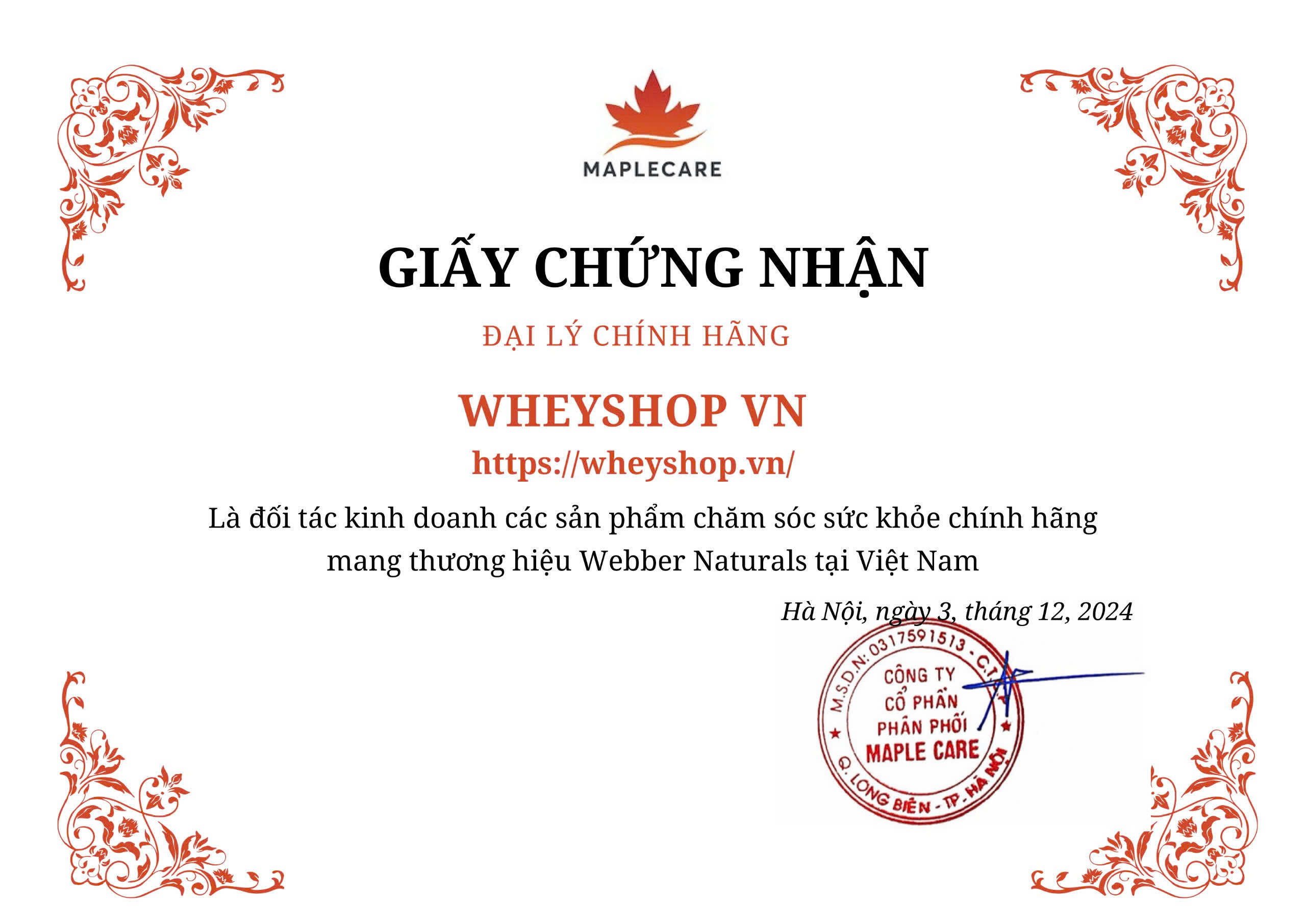 Webber Naturals là thương hiệu thực phẩm bổ sung uy tín đến từ Canada, nổi bật với hàng loạt sản phẩm hỗ trợ sức khỏe chất lượng cao, đã được kiểm chứng tại nhiều quốc gia. Tại WheyShop, bạn hoàn toàn có thể yên tâm lựa chọn sản phẩm Webber Naturals chính hãng với giá tốt, nguồn gốc minh bạch và tư vấn chuyên sâu theo từng mục tiêu sức khỏe.