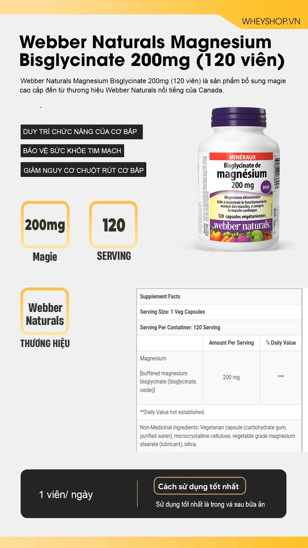 Webber Naturals Magnesium Bisglycinate 200mg phù hợp cho người lớn cần bổ sung magie, người hay căng thẳng, mất ngủ, chuột rút cơ bắp hoặc thiếu magie do ăn uống không đủ.