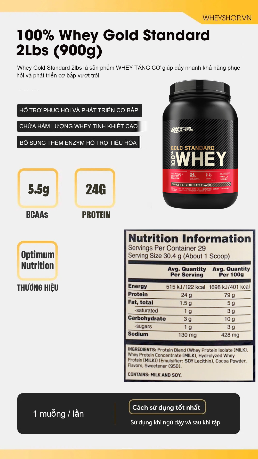 Whey Protein là sản phẩm gần như không thể thiếu đối với người tập thể hình. Trong số các dòng whey phổ biến, Whey Gold Standard 2lbs của Optimum Nutrition nổi bật với khả năng hỗ trợ tăng cơ, giảm mỡ hiệu quả.