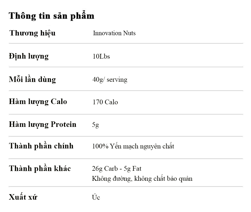 Innovation Daily Oats 10lbs là dòng yến mạch giảm cân ăn liền cao cấp đến từ thương hiệu Innovation Nuts. Sản phẩm được làm từ 100% yến mạch nguyên chất, không hương liệu, không đường, không chất bảo quản, đảm bảo nguồn dinh dưỡng tinh khiết và tiện lợi cho mọi đối tượng sử dụng. Với hàm lượng chất xơ và carbohydrate phức dồi dào, Innovation Daily Oats giúp cung cấp năng lượng bền vững, hỗ trợ tiêu hóa khỏe mạnh và kiểm soát cân nặng hiệu quả. |