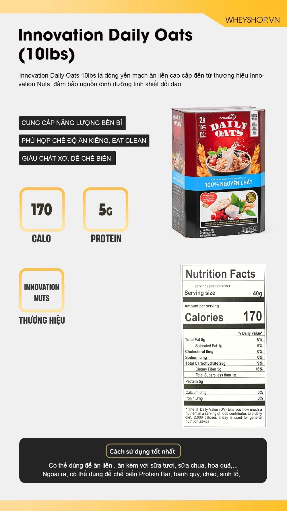 WheyShop là hệ thống bán lẻ thực phẩm bổ sung uy tín hàng đầu tại Việt Nam, được nhiều vận động viên và người tiêu dùng tin tưởng lựa chọn. WheyShop cam kết cung cấp sản phẩm Innovation Daily Oats 10lbs chính hãng, có đầy đủ giấy tờ chứng nhận nguồn gốc và chất lượng. Đội ngũ tư vấn viên chuyên nghiệp, giàu kinh nghiệm, sẵn sàng hỗ trợ khách hàng lựa chọn sản phẩm phù hợp và giải đáp mọi thắc mắc.