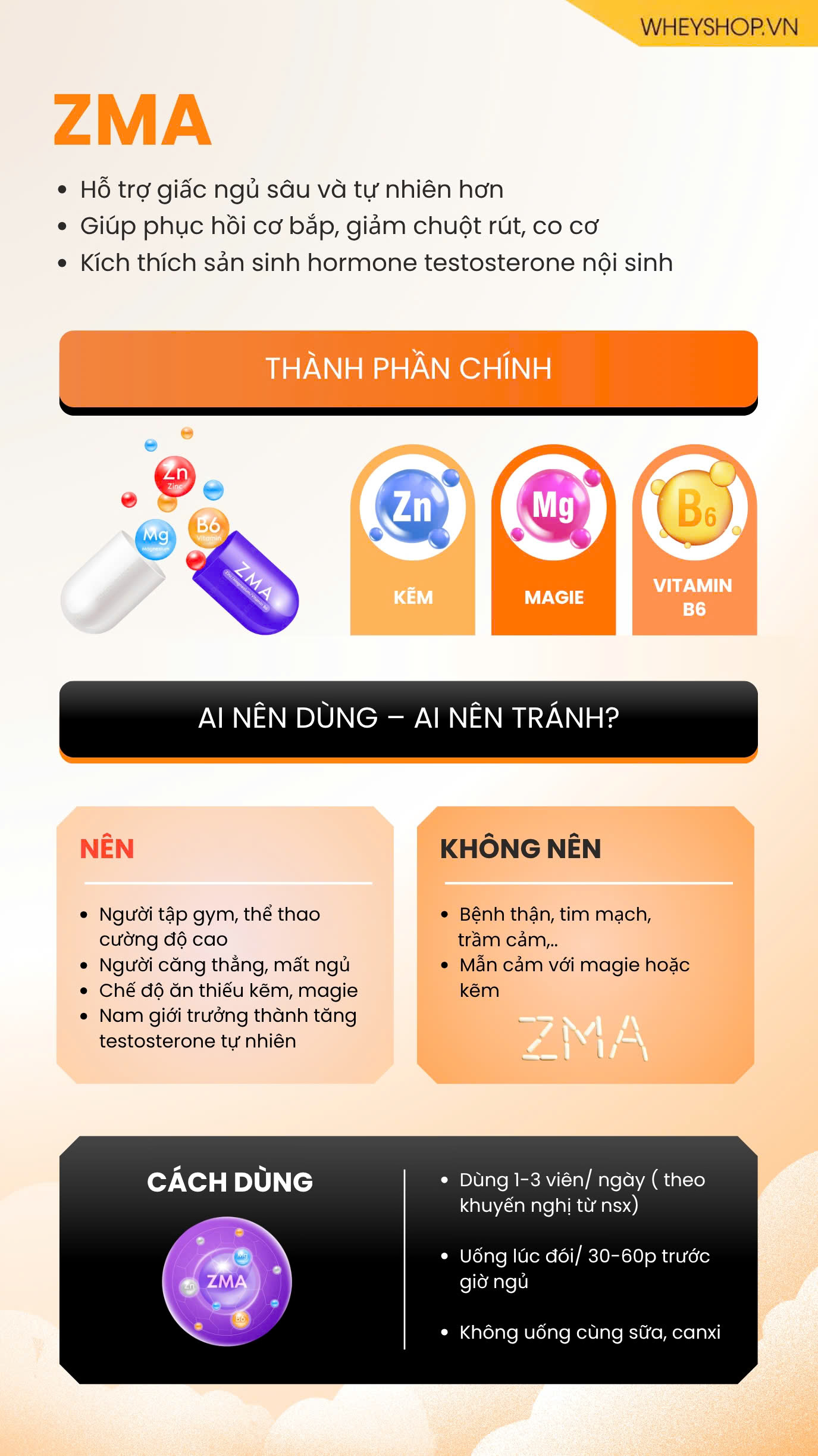 Có thể dùng cả hai, nhưng không nên uống cùng lúc. Whey chứa nhiều canxi – mà canxi lại làm cản trở quá trình hấp thu kẽm và magie trong ZMA. Tốt nhất nên uống cách nhau ít nhất 1 tiếng để cả hai đều phát huy hiệu quả tối đa.